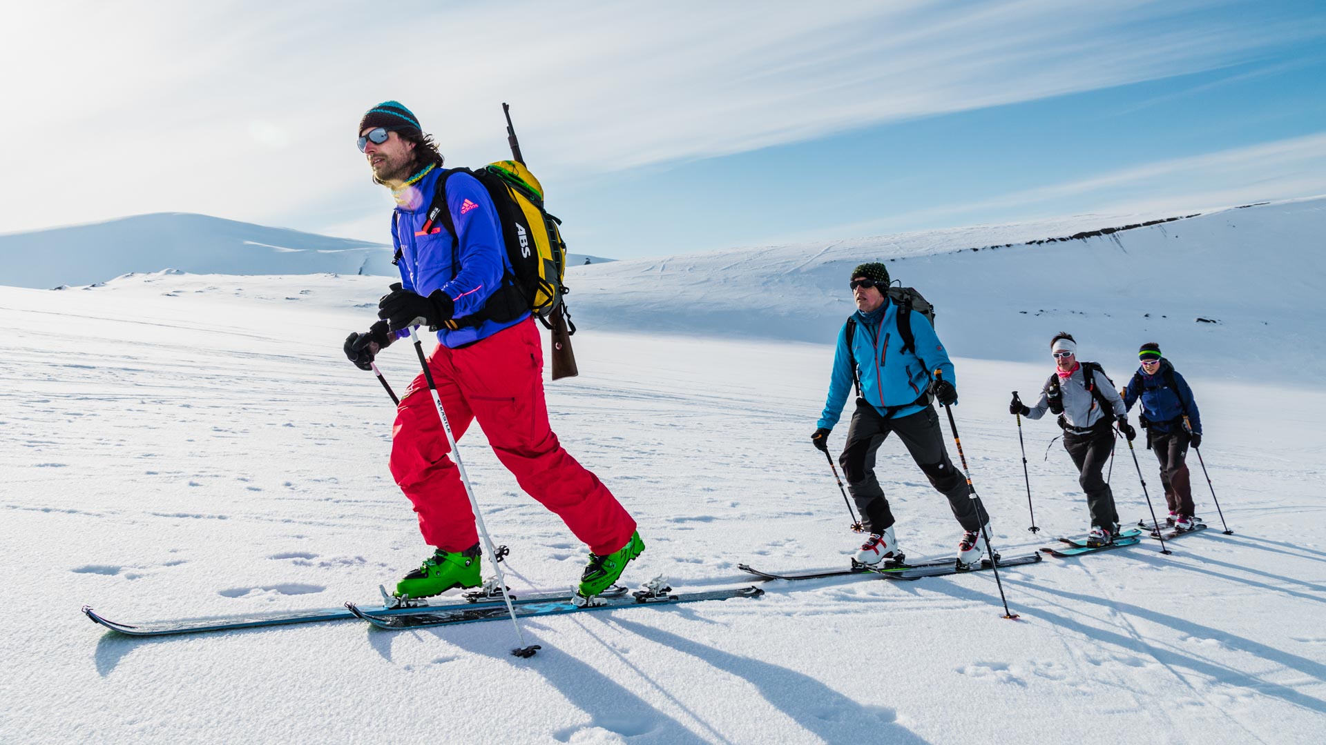 Fra toppen utfolder et enormt panorama seg: breer, fjorder, åpent hav — og stillhet, brutt bare av hviskingen fra ski på snø. Den enorme og stille arktiske naturen avslører sin fulle kraft.